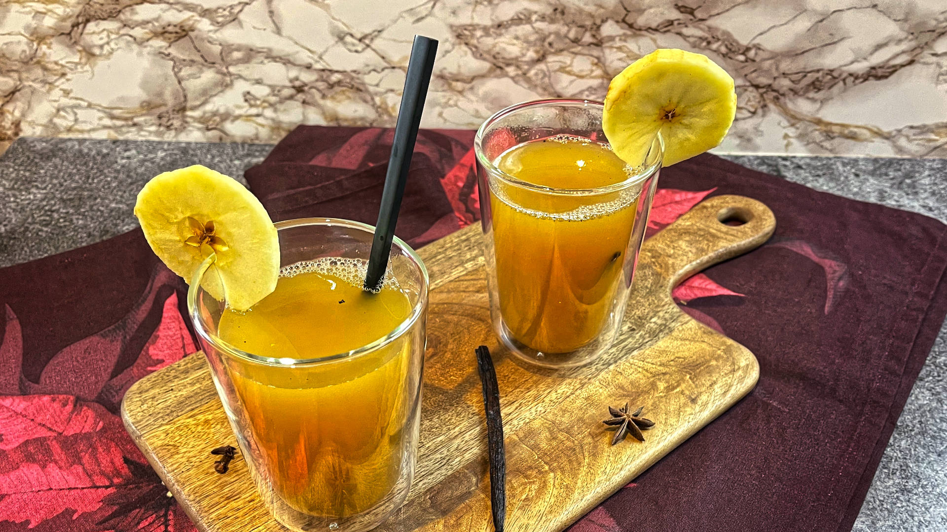 Glühwein durch ein Sieb abgießen, in Gläser füllen und mit Vanilleschoten und Sternanis dekorieren. Heiß servieren.